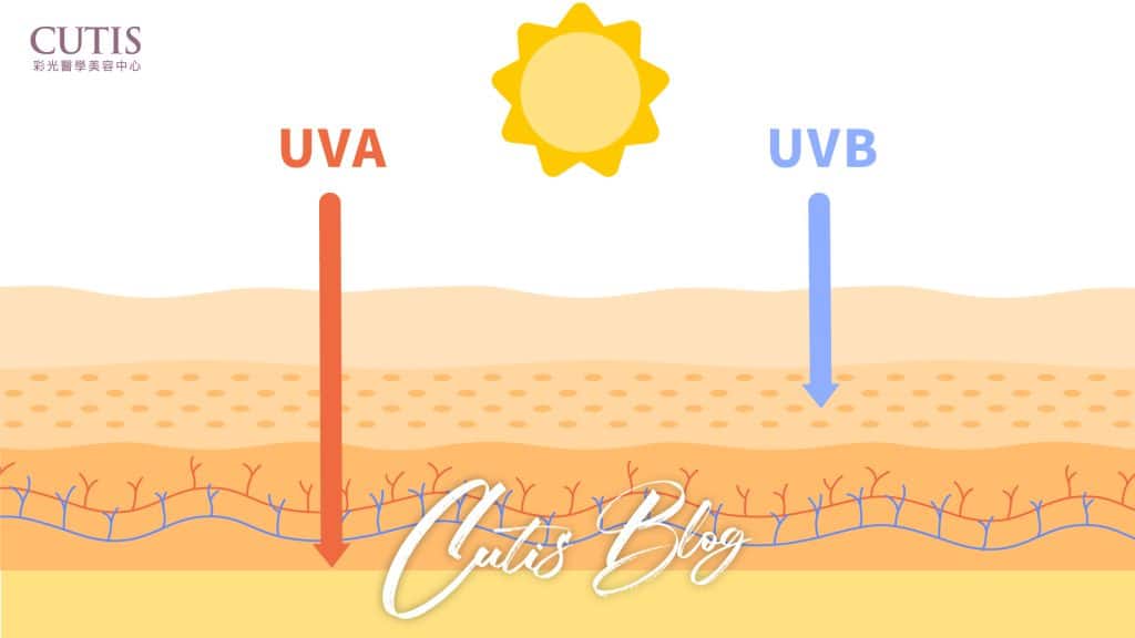 紫外線一般可分為UVA和UVB:UVA波長較長,穿透力較高,傷害可到達真皮層,但能量較低,會導致曬黑與皮膚老化;UVB波長較短,穿透力較低,能量較強,傷害主要集中表皮層,容易造成曬紅、曬傷,長期累積更會導致發炎因子增生及DNA損傷。