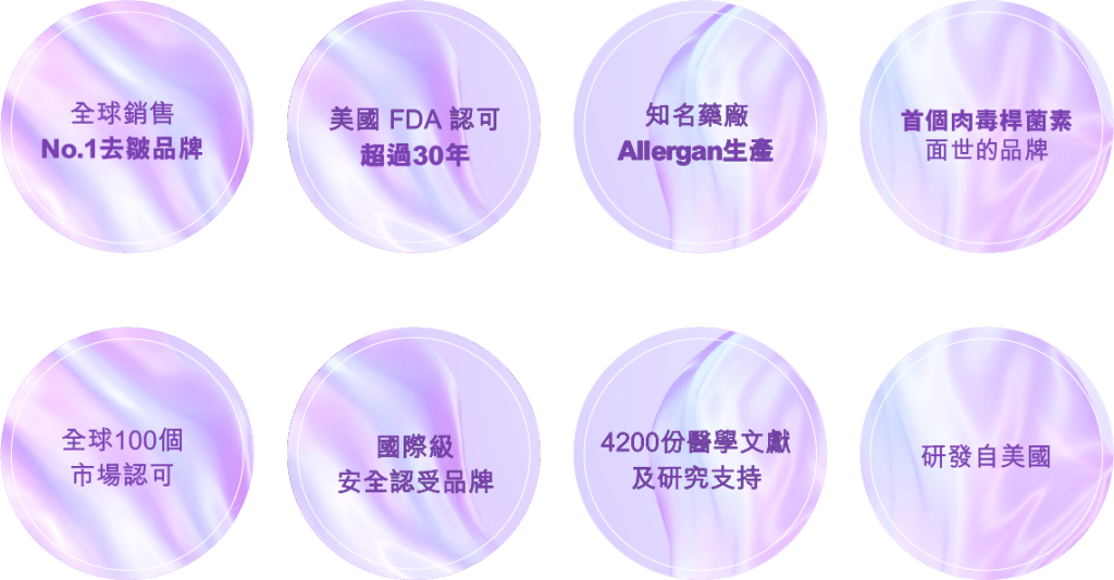 獲美國 FDA 認可用於中度至重度魚尾紋及膀胱過度活動綜合症。