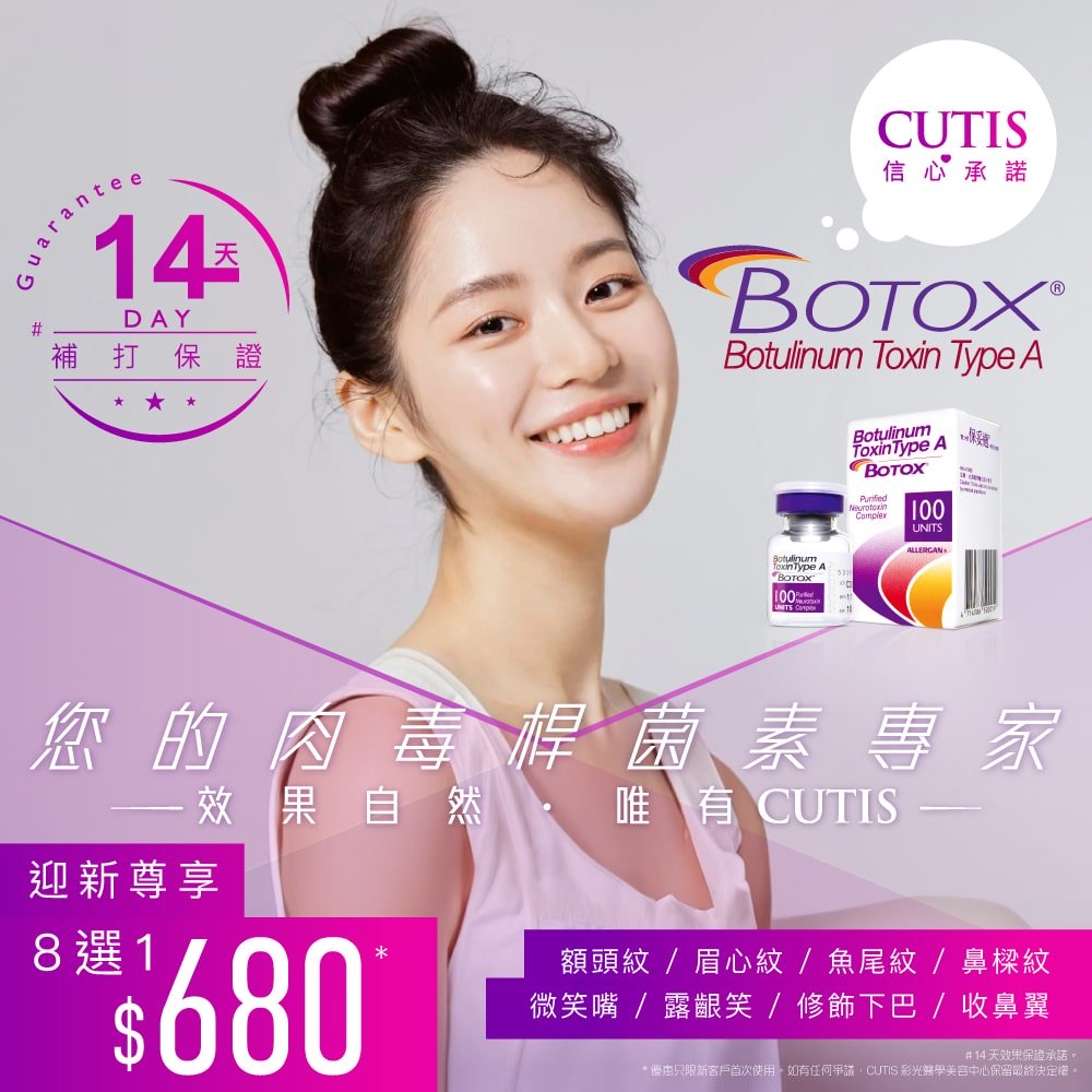 醫美療程需要專業及經驗,肉毒桿菌素專家CUTIS的療程由駐場醫生主導,施打部位精準,效果自然,絕不導致膠面;價格合理,而且不限劑量,更設免費補打,讓您在舒適環境中輕鬆變美變年輕。
