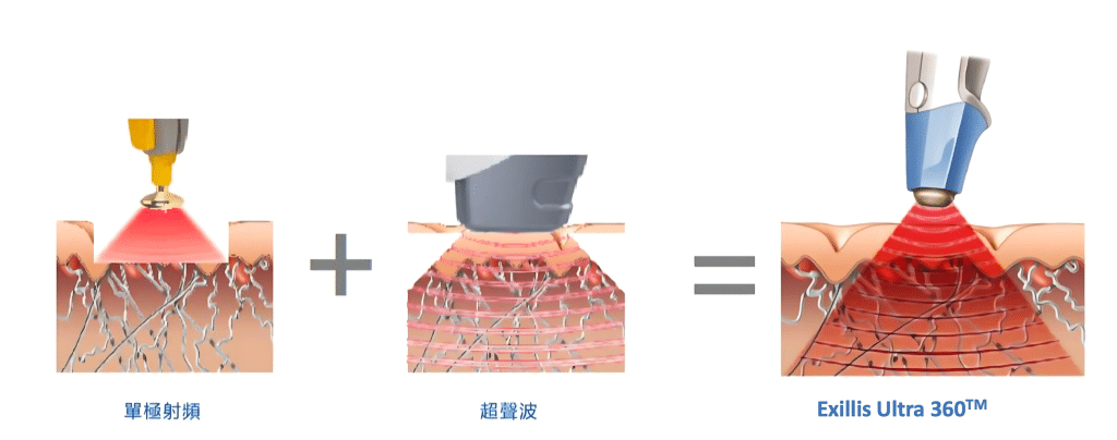 EXILIS ULTRA 360 採用BTL廠所生產的儀器進行,原理是把電流通過皮膚,電阻效應會 將真皮層加熱,改變骨膠原的基本結構而令其收縮,達到即時緊膚的 效果。收縮後的骨膠原會被身體吸收,從新長出來的骨膠原會變得更 厚及更富彈性,所以能夠撫平皺紋,也能夠緊緻肌膚。另外,這台儀 器擁有兩個探頭,較細的機頭是用於眼部、面部一些更細微的位置及 女性的陰部(當然是用全新及即棄的機頭);較大的機頭是用於身體的 不同部位。