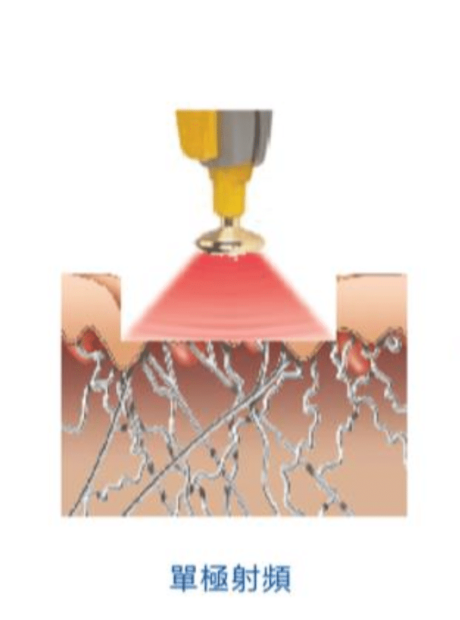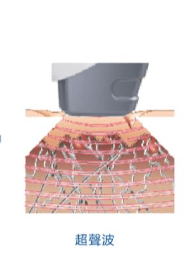單極射頻結合超聲波交融技術,利用電流通過肌膚,電阻效應會 將真皮層加熱,立即改變骨膠原的基本結構而令其收縮,達致即 時緊膚的效果,收縮後的膠原蛋白會被身體吸收,重新長出來的 骨膠原會變得更厚及更富彈性,從而達致撫平皺紋及緊緻肌膚的 效果。
