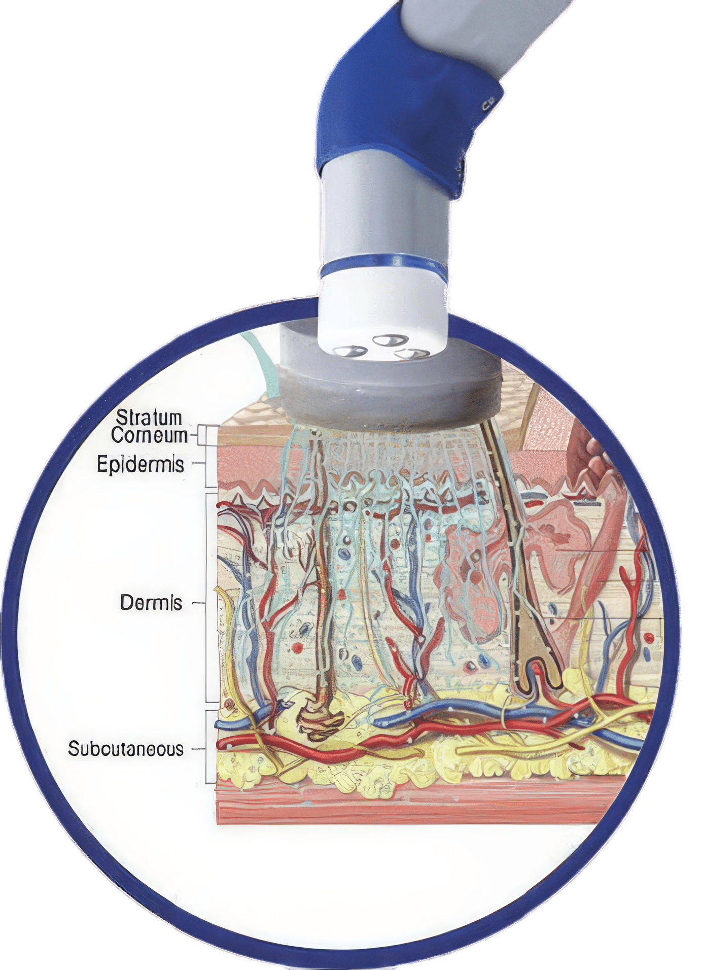 DEP無針注射以低脈衝電流2200HZ改變細胞的極性,皮膚在2秒內迅速張開數百個微孔,讓微分子及大分子滲透至表皮、真皮及皮下組織,在無痛、 無創及無注射的前提下,繞過角質層,將吸收率提高至80%