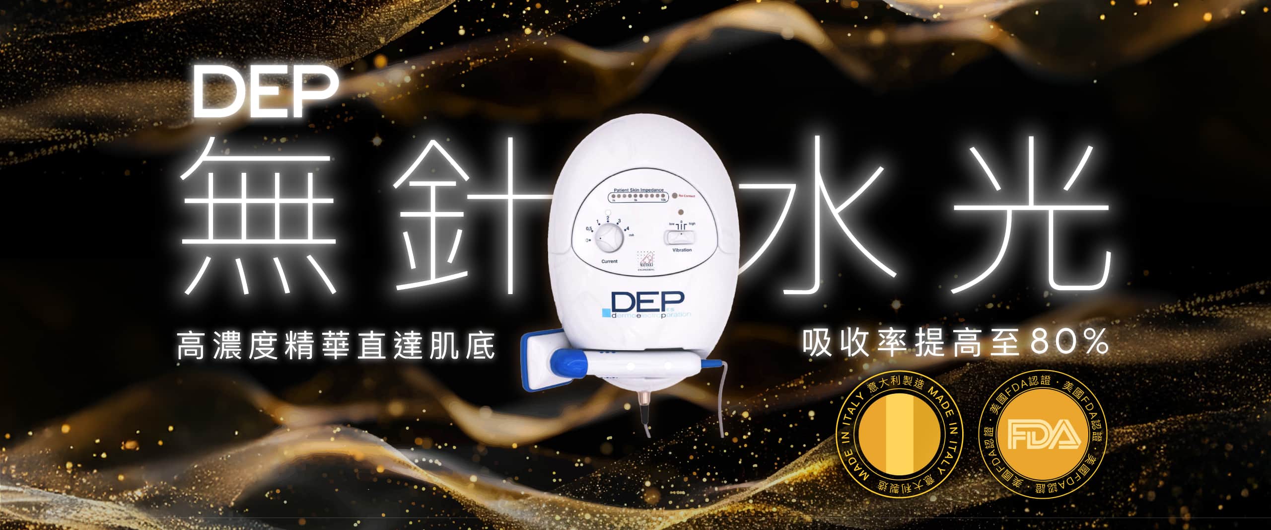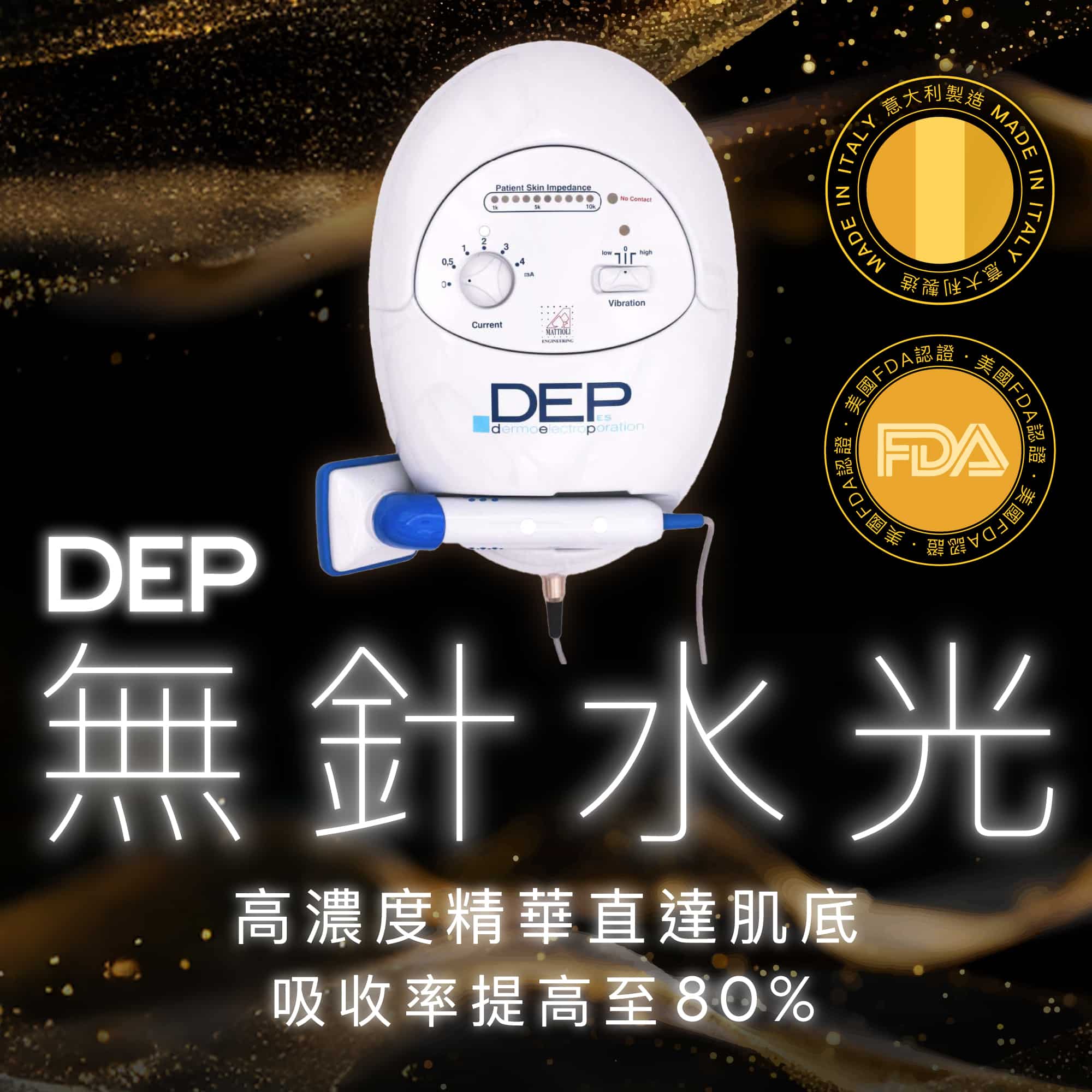 DEP(Dermoelectroporation) 無針注射運用專利無創電子皮膚穿透技術,利用電子脈衝傳遞及振動方式,打開肌膚的水基通道,使活性成分、微分子和大分子精華 (例如:透明質酸、維他命等) 能夠輕易滲透到皮膚深層,從而發揮更好的護膚效果,即時改善各種肌膚問題。