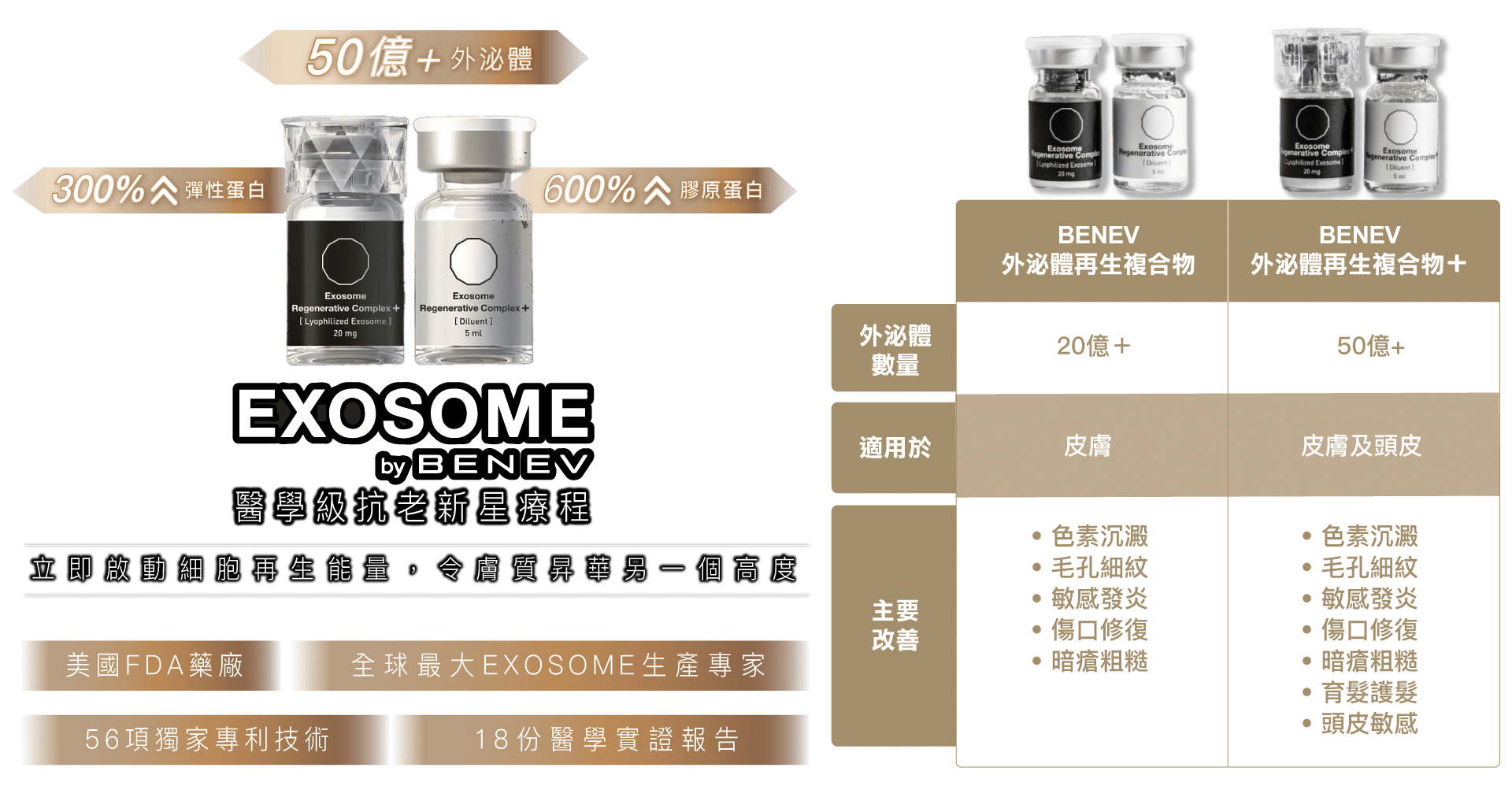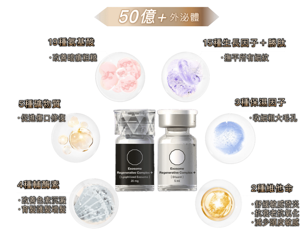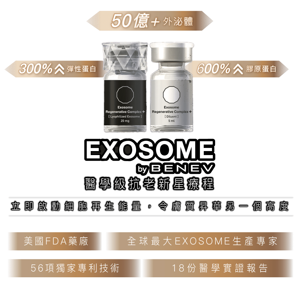 外泌體(Exosome)是一種極微小的細胞囊泡,內含高濃度幹細胞生長因子蛋白、RNA (核糖核酸)、miRNA(微核糖核酸)、脂質等豐富基因生物訊息。研究表明,外泌體是細胞之間的「郵差」,負責細胞間的訊息傳遞及溝通。外泌體尺寸極其細小,只在30-200nm之間(即約頭髮的 2000分之1),滲透性極高,能夠輕易到達其他細胞組織,確保訊息傳遞過程暢順,有助支持細胞再生和組織修復。CD9、CD63及CD81為外泌體外膜上特有的蛋白質,透過檢驗外泌體產品的以上蛋白質含量,可判斷外泌體是否純正或含有雜質