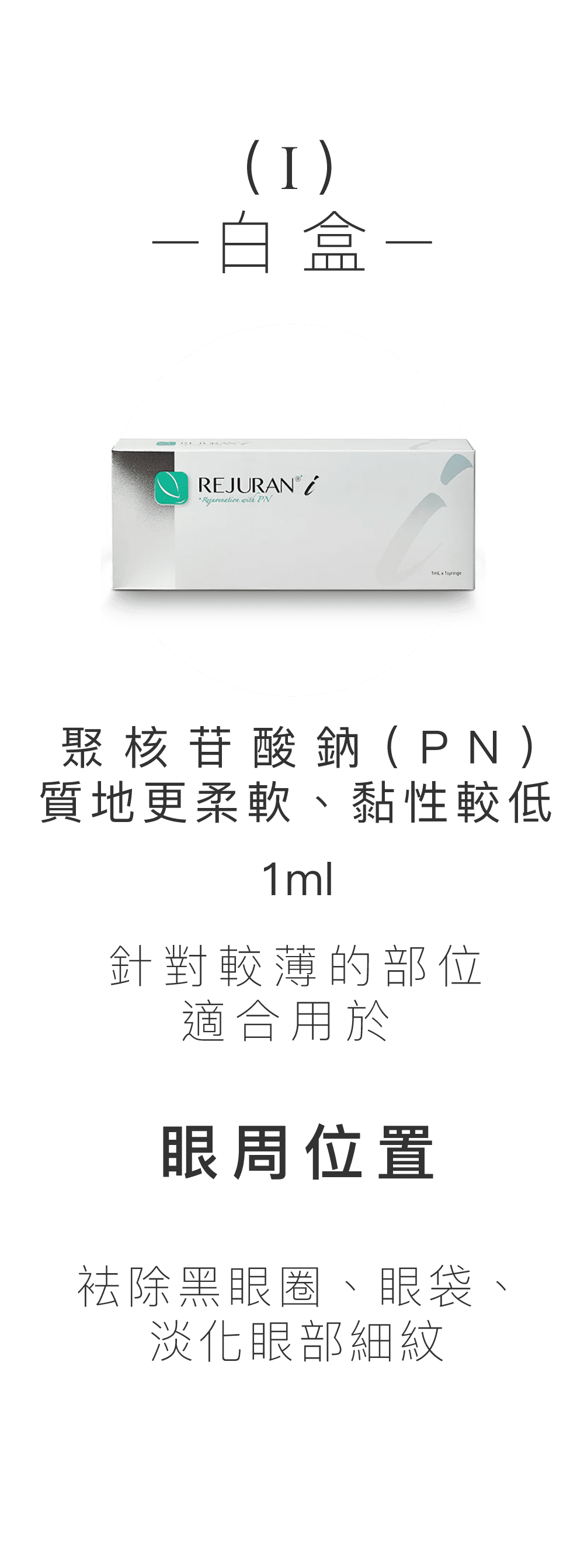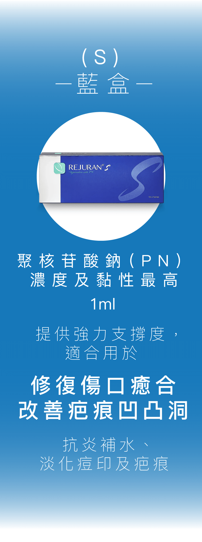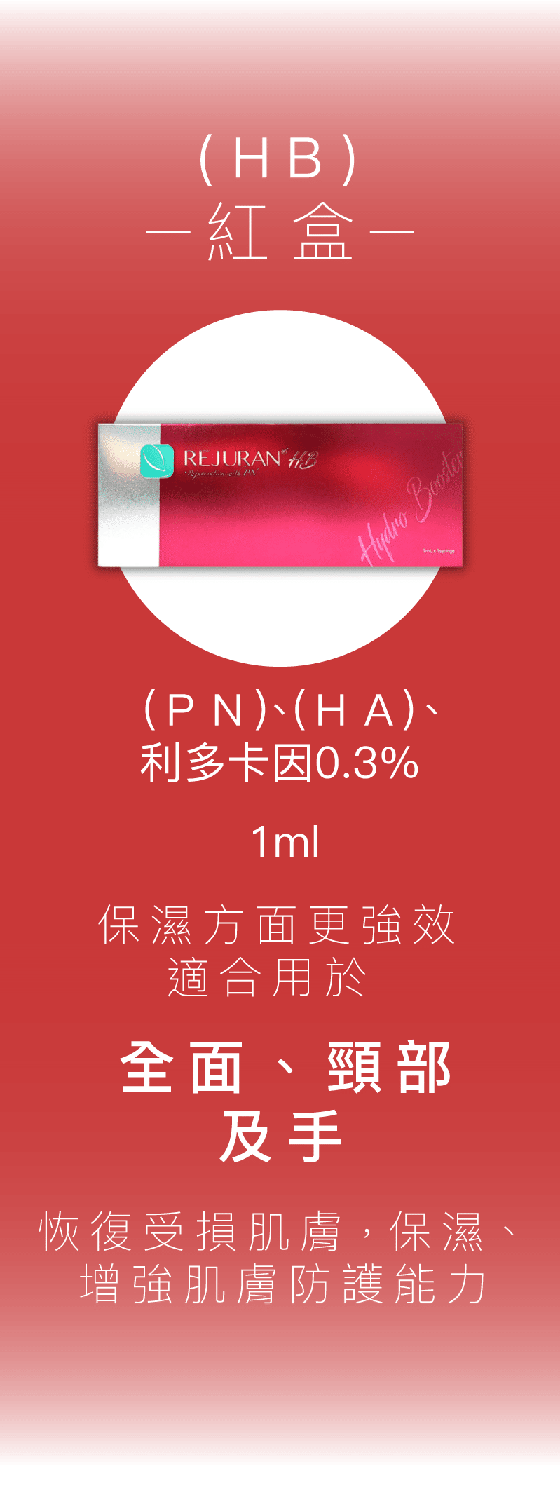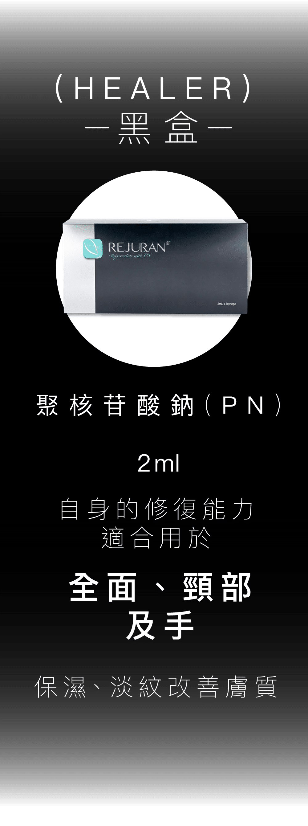 麗珠蘭Rejuran在韓國醫美界擁有眾多美譽,其中水光針劑系列被譽為韓國頂級的水光針,包括黑盒、紅盒、白盒和藍盒。因超過95%的韓國明星使用,所以常被稱為「藝人針」。麗珠蘭Rejuran採用單一成份,提取自三文魚DNA的多核苷酸 PN (Polynucleotide),這種成份能與人體結合,在體內持續保持形態並被逐漸吸收分解。透過將多核苷酸PN(Polynucleotide)直接注射到真皮層來促進皮膚組織再生,增加皮膚彈性、減少皺紋、提亮膚色、收毛孔等功效。