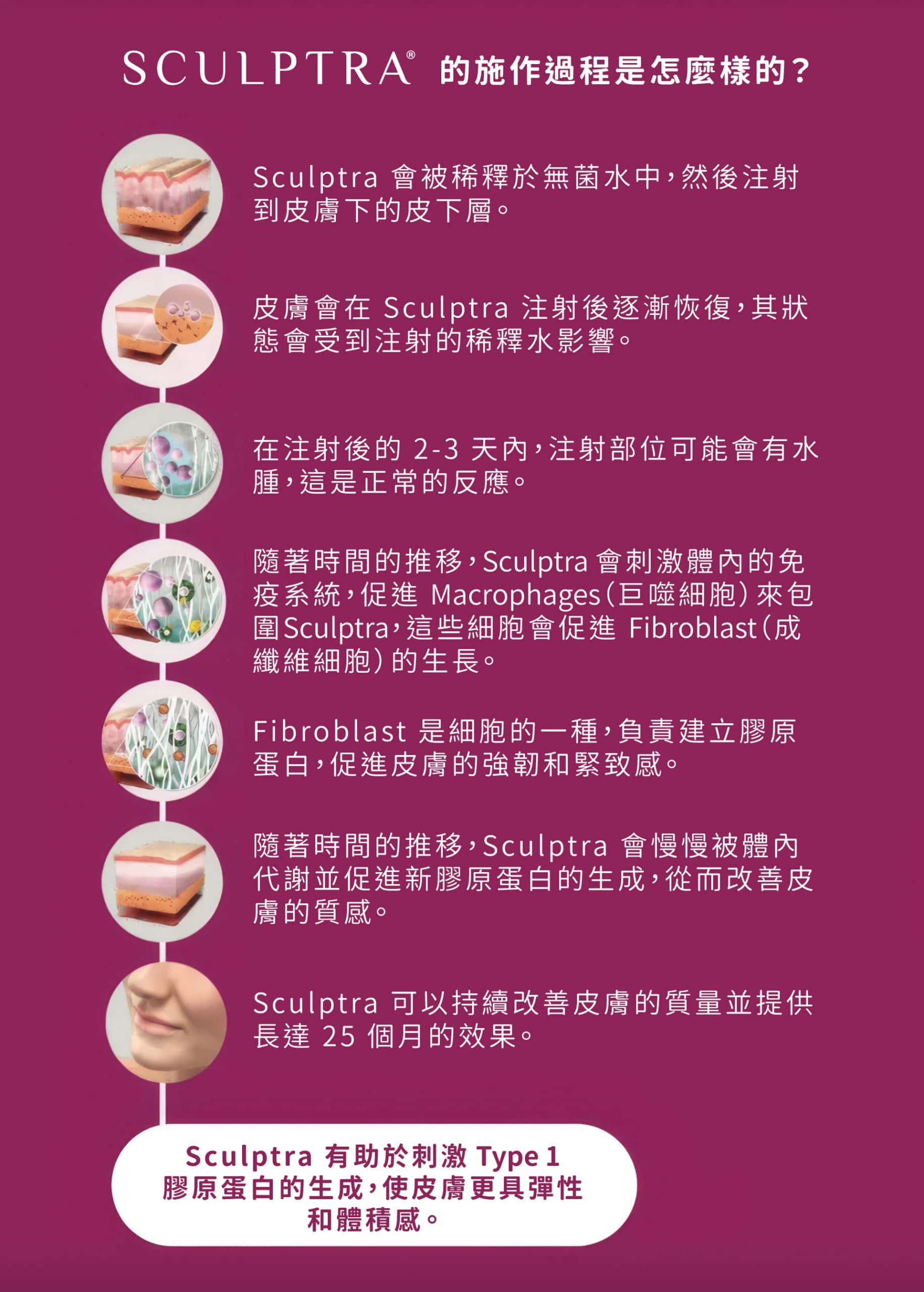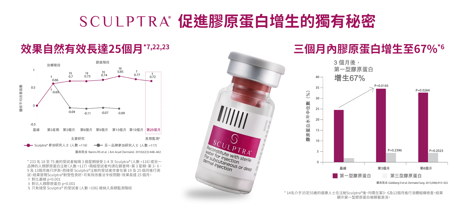 Sculptra® 塑然雅有效針對衰老的根源,通過刺激體內膠原蛋白增生以改善肌底結構,回復肌底彈力、平滑。 臨床研究證實Sculptra® 塑然雅能於3個月重啟膠原蛋白自我增生67%。療程效果短至3星期便可見效,並長效持久至25個月。