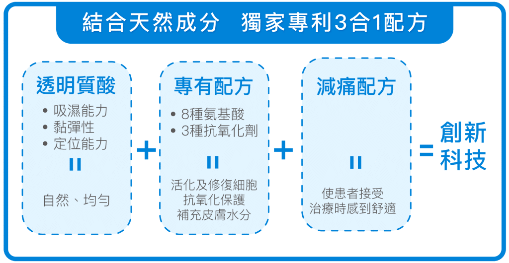 內含有獨家專利配方 (8種氨基酸、3種抗氧化物、2種礦物質、1種維生素) 的透明質酸,氨基酸能促進細胞重組及膠原蛋白和彈性蛋白的產生,抗氧化物有效中和自由基,保護肌膚免受環境侵害、促進皮膚亮白,礦物質鋅及 銅能促進細胞修復,而維生素B6可以促進皮膚的生長和修復,14款成份為肌膚提供必需的營養,有助延緩皮膚衰老。